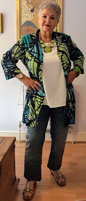 I stayed with the same trousers on Thursday just adding this pre-loved tunic bought in Ireland in 2013 and my red Monsoon sandals. All jewellery pre-loved. Thursday, as always, was busy. It started with an hour's walk with the dog followed by swimming. I swam 36 laps; getting out of the pool early as I had to take my youngest grandson to an appointment at the orthodontist at Bedford Hospital. Once that was over it was off to do the Lidl and Sainsbury's weekly shop. I was very lucky as my son came with me and that was a great help. Home to start cooking and unpacking the shopping. Both grandsons were there for dinner and middle grandson had received his re-sit 'A' level results. He did much better this year. I'm so proud of him as he had no help from the Sixth Form College in the way of revision classes and did it all by himself. He's decided to take up the offer from Brighton University and will start in late September. Well done, Isaiah!