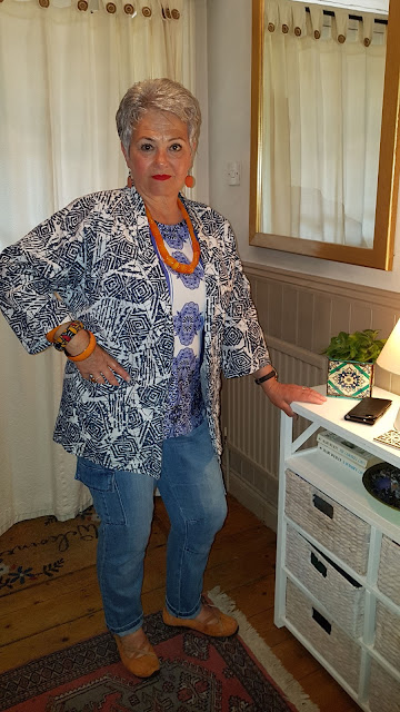 On Monday, I volunteered as usual and wore one of the items I bought the previous Friday in Barnardo's. This dress/tunic/long shirt is by Tu and I loved the pattern of repeating fans. I think it was 3.50. Navy trousers retail from Matalan some years ago and navy top from a 1.00 rail somewhere. It's also old maybe 6 or 7 years and of course it wasn't new when I bought it!