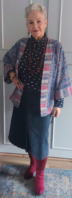 This was what I wore to Barnardo's. Everything charity shopped. Dress by Tu; boots as before; tights were a gift from my daughter and the jacket was a summer buy from RSPCA in Newport Pagnell. All jewellery charity shopped.
