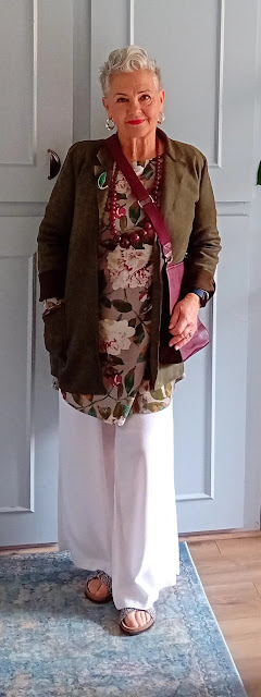 It was a warm day but mostly overcast. I wore these pre-loved M&S trousers and this tunic top with no label. I love the print. Sandals by Brakeburn; retail. Pre-loved suedette jacket by F&F and bag also pre-loved. I have a collection of coloured cross body bags and am making more of an effort to match them to my outfits. This one is an ox blood colour which is found in the tunic, too.